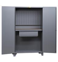 Heavy-duty 12 gauge steel, all-welded cabinet features either a 16 gauge steel pegboard or louvered panel and a 42" high hardboard work surface to efficiently organize, store, and work in one convenient location. 250 lb. capacity drawer measures 26"W x 20"D x 6"H and provides ample storage for loose or hard to hang tools. The heavy-duty drawer features heavy-duty rollers, a full-width recessed handle, and a padlock hasp. Clearance under drawer is 23-1/2". Keyed handle with 3 point locking system keeps doors secure. 5-1/2" ground clearance permits movement by pallet truck.