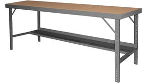 Adjustable Height Folding Leg Workbench with 14 gauge steel top covered by durable tempered hard board, bench height can be adjusted and provisions for optional drawer, gray