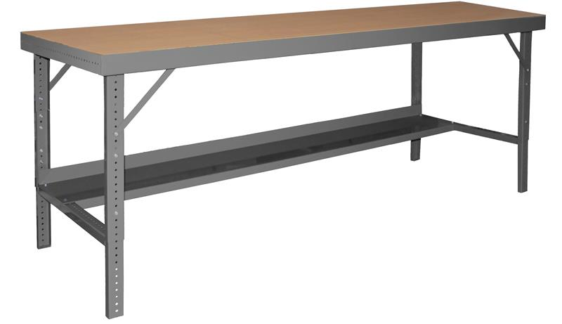 Adjustable Height Folding Leg Workbench with 14 gauge steel top covered by durable tempered hard board, bench height can be adjusted and provisions for optional drawer, gray