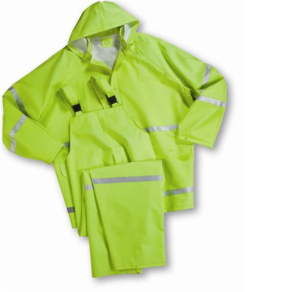This 3 piece rainsuit of .35mm PVC on polyester construction is great when visibility is important. High Visibility Lime Green color makes you stand out on the job.