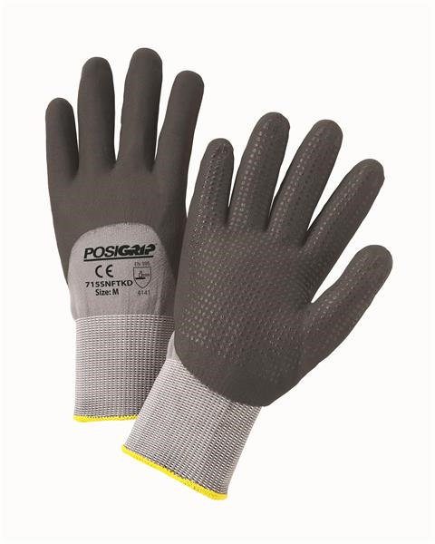 Gray nylon shell with black 3/4 coated microfoam nitrile with dotted palm and micro capillaries for flexibility, enhanced oil grip, breathability and comfort.