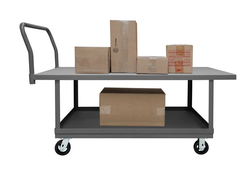 2 Deck Platform Truck with 5" x 2" Mold-On-Rubber casters, (2) rigid and (2) swivel, lips down with removable, tubular offset push handle, gray