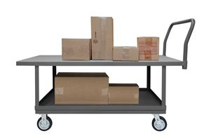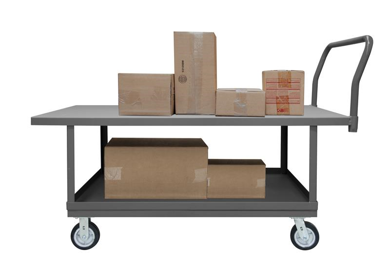 2 Deck Platform Truck with 6" x 2" Mold-On-Rubber casters, (2) rigid and (2) swivel, lips down with removable, tubular offset push handle, gray