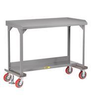 3,600 lbs. capacity. All-welded, 12 gauge steel construction. 2 rigid and 2 swivel, 6" polyurethane wheels. 1-1/2" raised edge on back and sides.